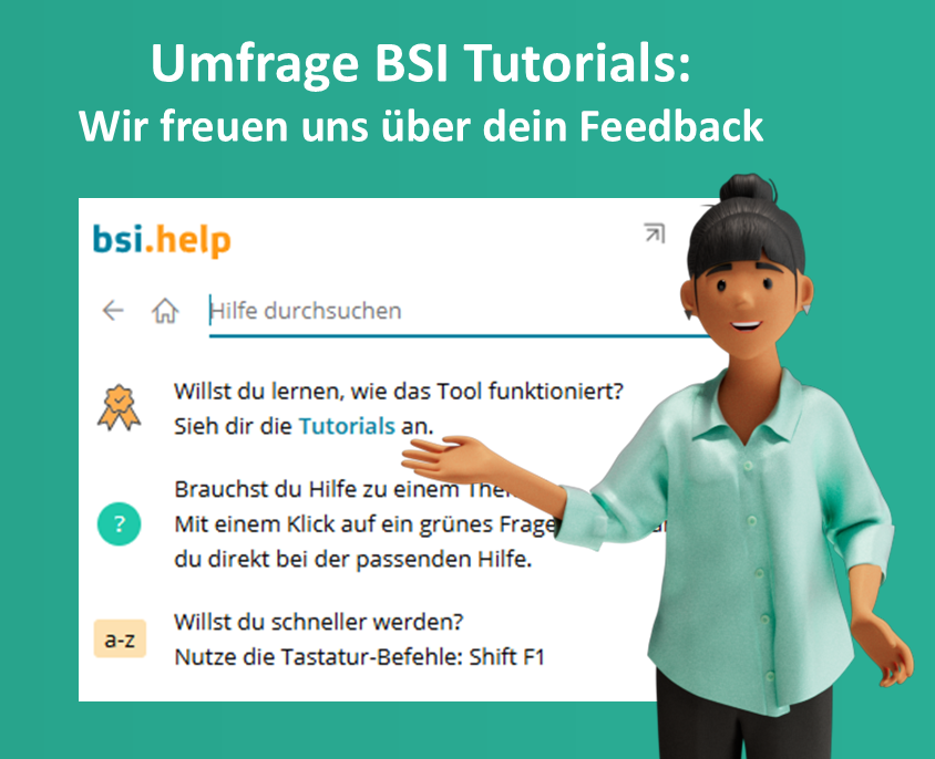 Wir möchten erfahren, wie die Tutorials der BSI Customer Suite in deinen Projekten genutzt werden – oder warum sie möglicherweise nicht zum Einsatz kommen. So können wir gezielt an Verbesserungen arbeiten.